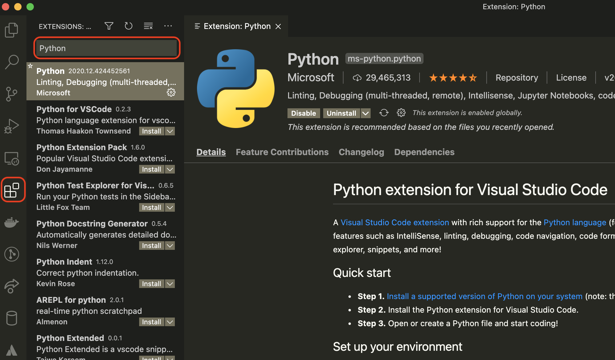 次に Python の開発環境を整えるための VSCode 拡張機能をインストールします。