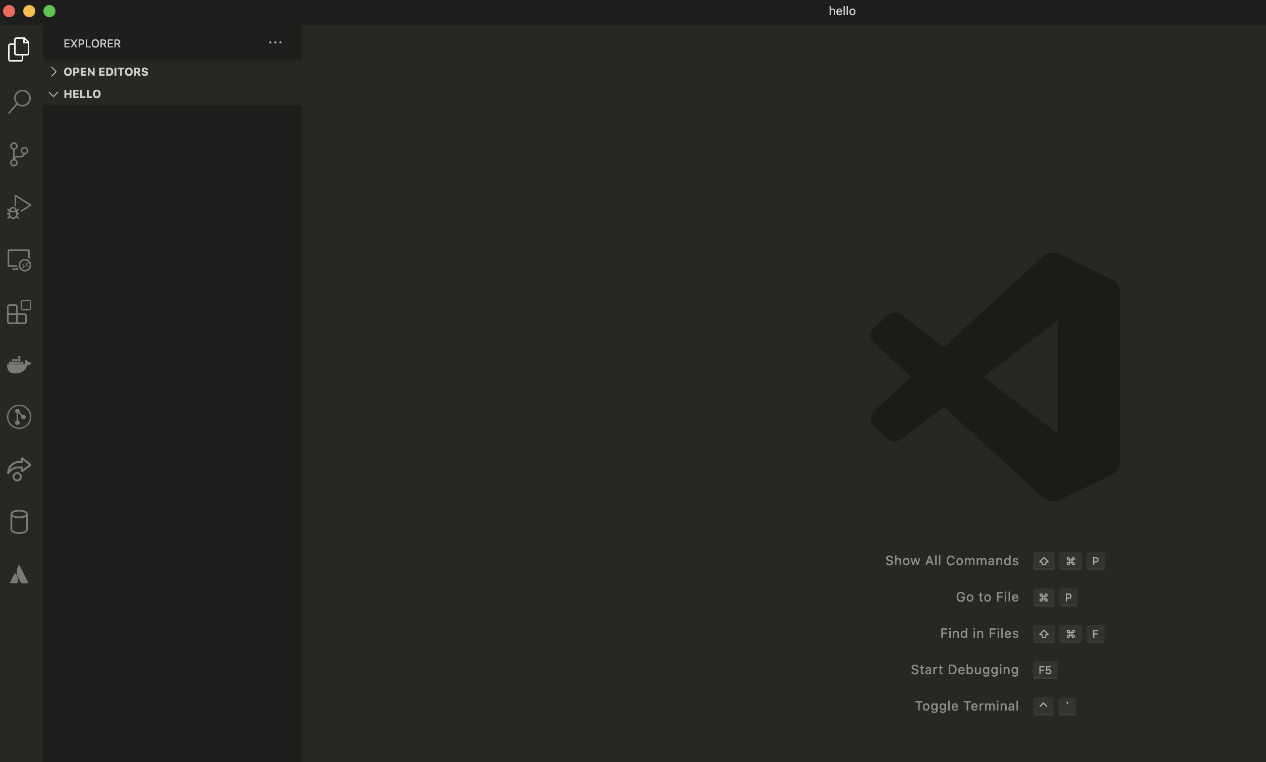 まずターミナル上で hello というディレクトリを作成し、それを VSCode で開きます。