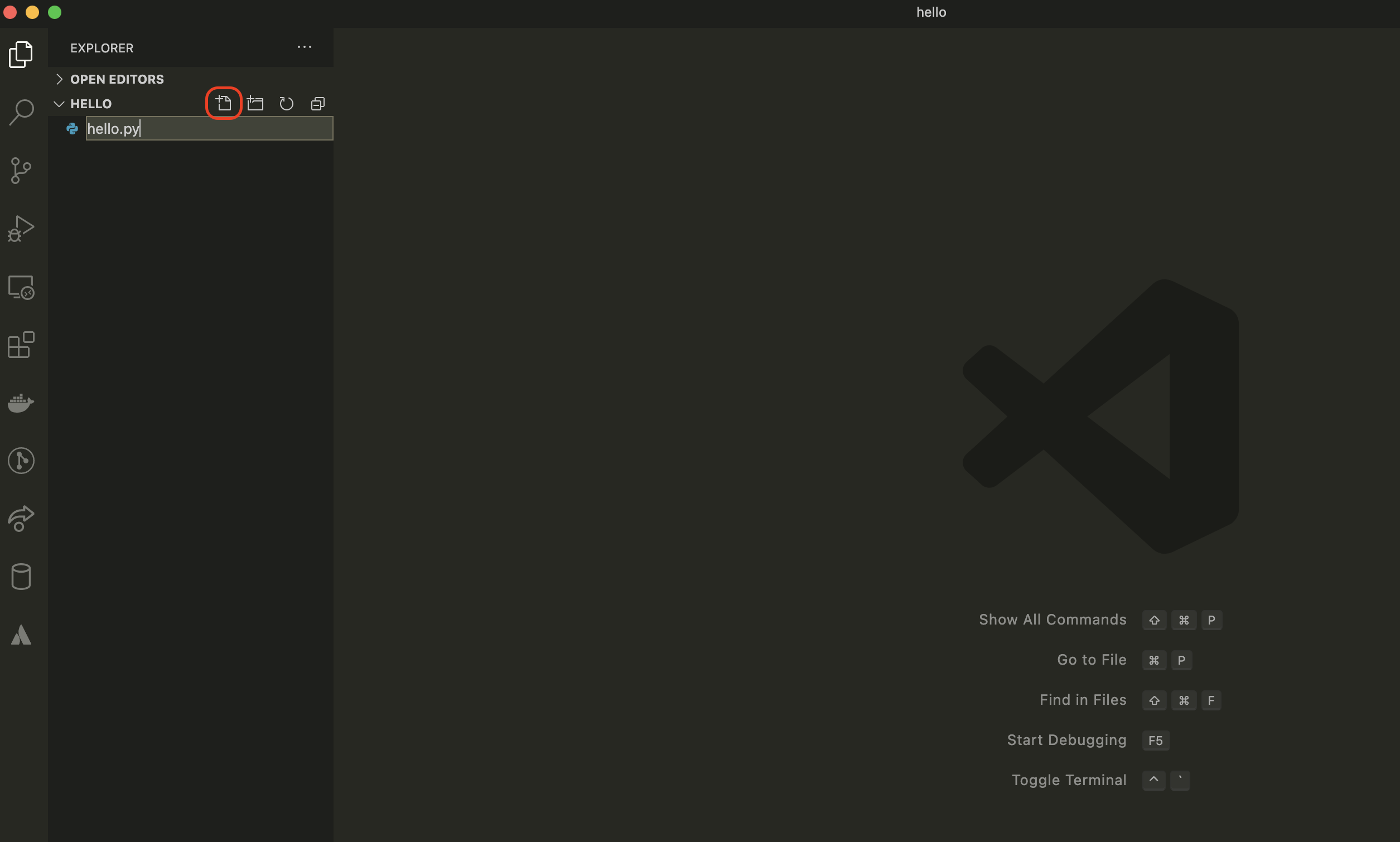 次にファイルの新規作成のアイコンを押して hello.py という名前のファイルを作成します。
