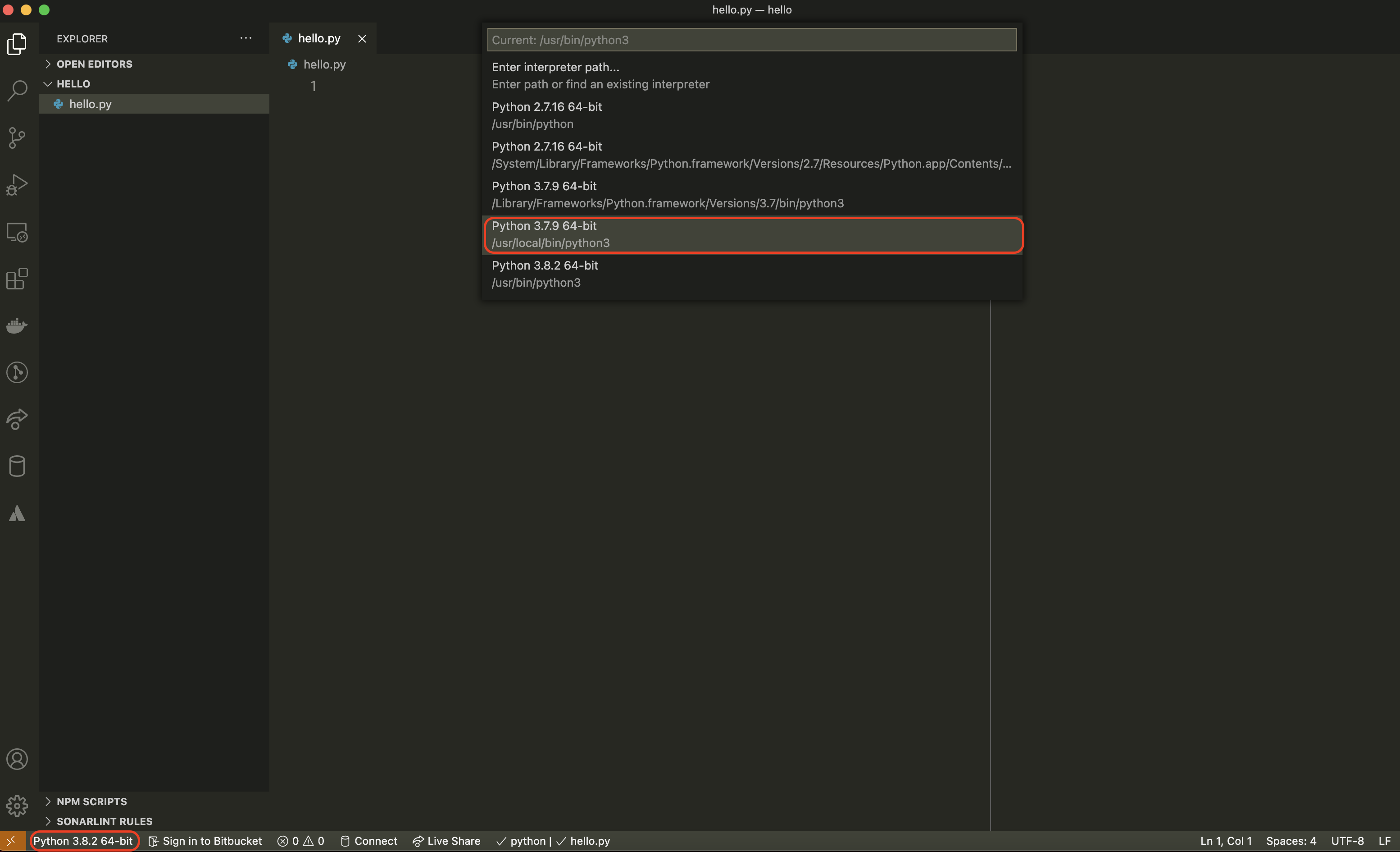 ファイルを作成してそのファイルを開くとウィンドウの左下に使用する Python のバージョンが表示されます。 このバージョンがインストールした Python のバージョンと異なる場合は Python のバージョンをクリックすると 使用する Python を変更することができます。
